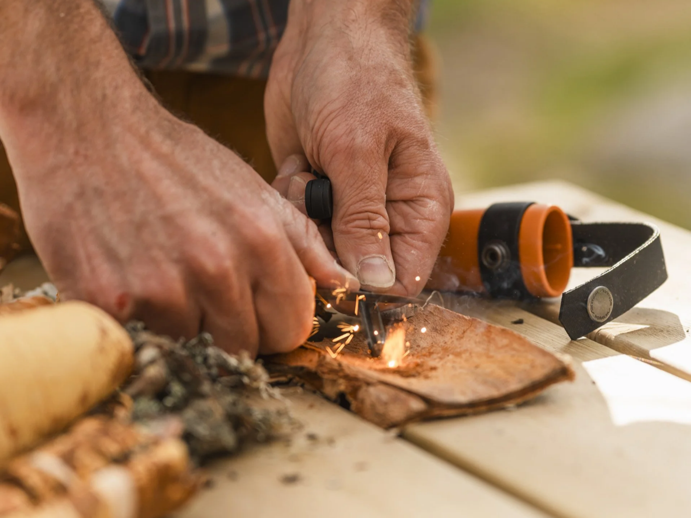 Bli bekväm med att göra upp en eld i alla väder. För trygghet och värme. Delta i en workshop där du lär dig grunderna och teknik i att göra upp en säker brasa - utan tändstickor. Vi använder yxa, kniv och tändstål